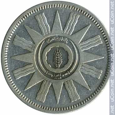 الوجه الامامي منقوش 14 تموز / 1958 / الجمهرية العراقية والوجه الخلفي منقوش 1378 / 1959 / 50 فلسا / الجمهورية العراقية.