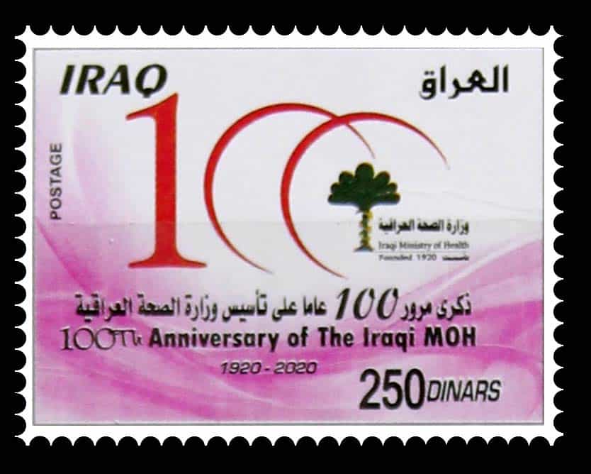 $aصدر الطابع بمناسبة مرور 100 عام على تأسيس وزارة الصحة العراقية في 1920.