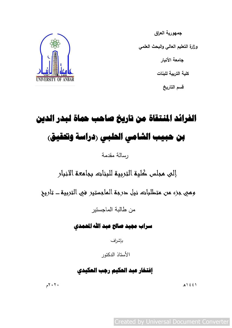 $aالفرائد المنتقاة من تاريخ صاحب حماة لبدر الدين بن حبيب الشامي الحلبي : $bدراسة وتحقيق = Al.Faraaid Al.Muntaqaa min Tarikh sahib Hama by Badr Al.Din bin Habib Al- Shami Al- Halabi : Study and investigation / $cسراب مجيد صالح عبد الله المحمدي ؛ بإشراف الأستاذ الدكتور إفتخار عبد الحكيم رجب العكيدي.