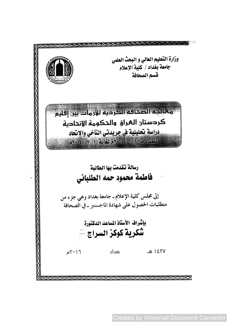 $aمعالجة الصحافة الكردية للأزمات بين إقليم كردستان العراق والحكومة الاتحادية : $bدراسة تحليلية في جريدتي التآخي والاتحاد للمدة من 1/1/2014م لغاية 1/7/2014م = The Treatement of the Kurdish Press For Crises Between Kurdistan Region & The Union Government : An Analytical Study in Al- Taakhi & Al- Attihad News Papers For the period from 1/1/2014 to 1/7 2014 / $cفاطمة محمود حمه الطلباني ؛ بإشراف الأستاذ المساعد الدكتورة شكرية كوكز السراج.