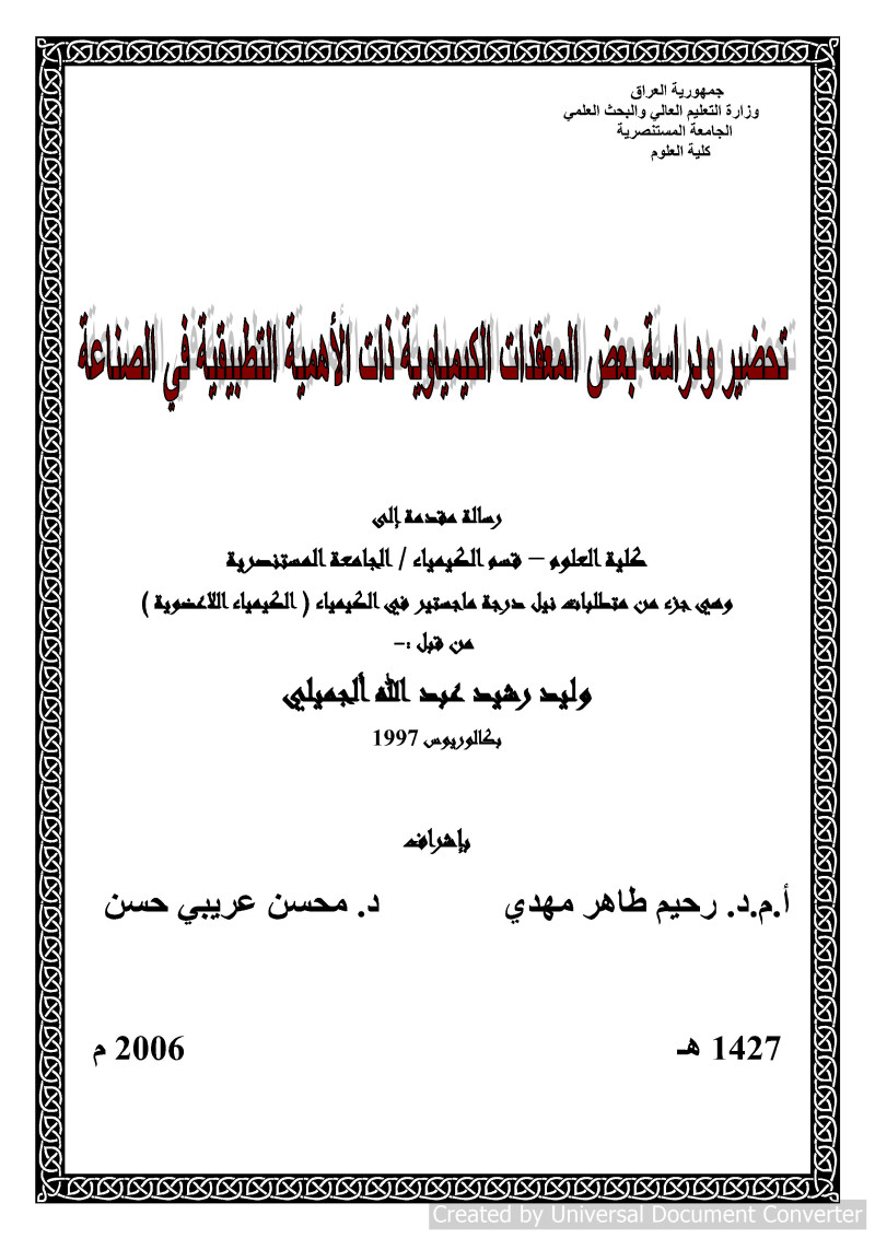 $bماجستير $cالجامعة المستنصرية، كلية العلوم، قسم الكيمياء $d2007.