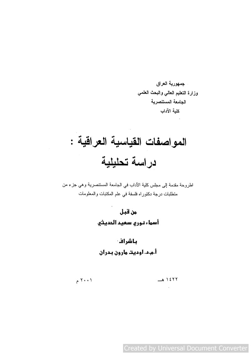 $aالمواصفات القياسية العراقية : $bدراسة تحليلية = Iraqi Standard Specifications : An Analytical Study / $cمن قبل أسماء نوري سعيد الحديثي ؛ باشراف أ.م.د. اوديت مارون بدران.