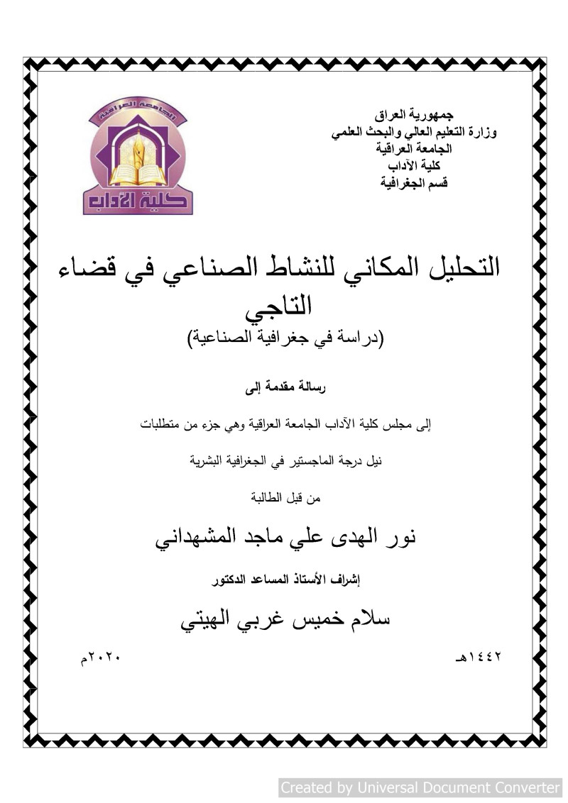 $aالتحليل المكاني للنشاط الصناعي في قضاء التاجي : $bدراسة في جغرافية الصناعية = Spatial analysis of industrial activity in Al-Taji district : a study in industrial geography / $cنور الهدى علي ماجد المشهداني ؛ إشراف الأستاذ المساعد الدكتور سلام خميس غربي الهيتي.