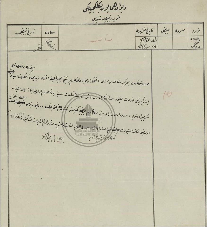 تكريم من السلطان محمد الخامس لشيخ عشيرة البو محمد مجيد الخليفة ملتزم مقاطعة مجر كبير، بوسام عالي عثماني ودرجة رابعة لخدماته وإخلاص صداقته.
