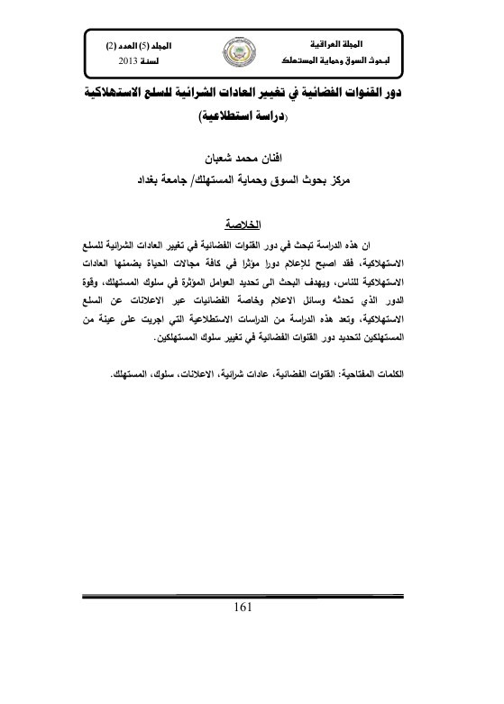 دور القنوات الفضائية في تغيير العادات الشرائية للسلع الاستهلاكية : دراسة استطلاعية = The role of channels satellite in changing the habits buying to the merchandise consumption : Survey study / افنان محمد شعبان.