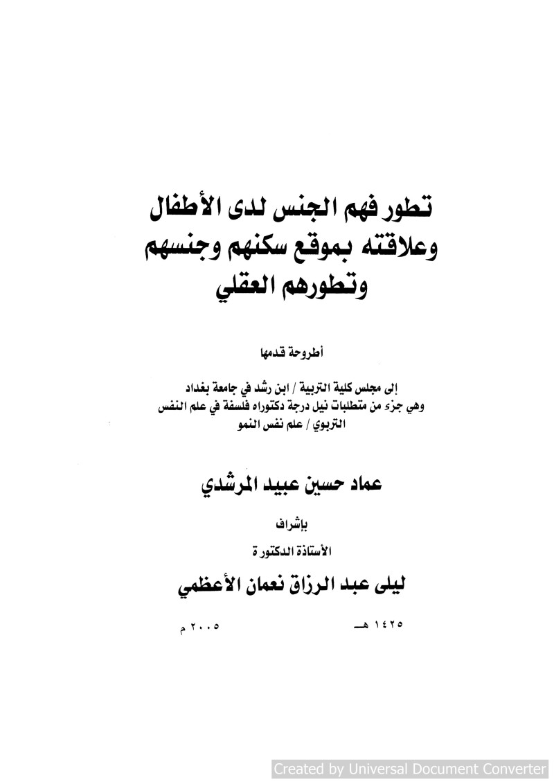 تطور فهم الجنس لدى الأطفال وعلاقته بموقع سكنهم وجنسهم وتطورهم العقلي = Development Gender Understanding for Children and its Relation with Child’s Location Living, Sex, and Mental Development / مستخلص أطروحة قدمها عماد حسين عبيد المرشدي ؛ بإشراف الاستاذة الدكتورة ليلى عبد الرزاق نعمان الأعظمي.