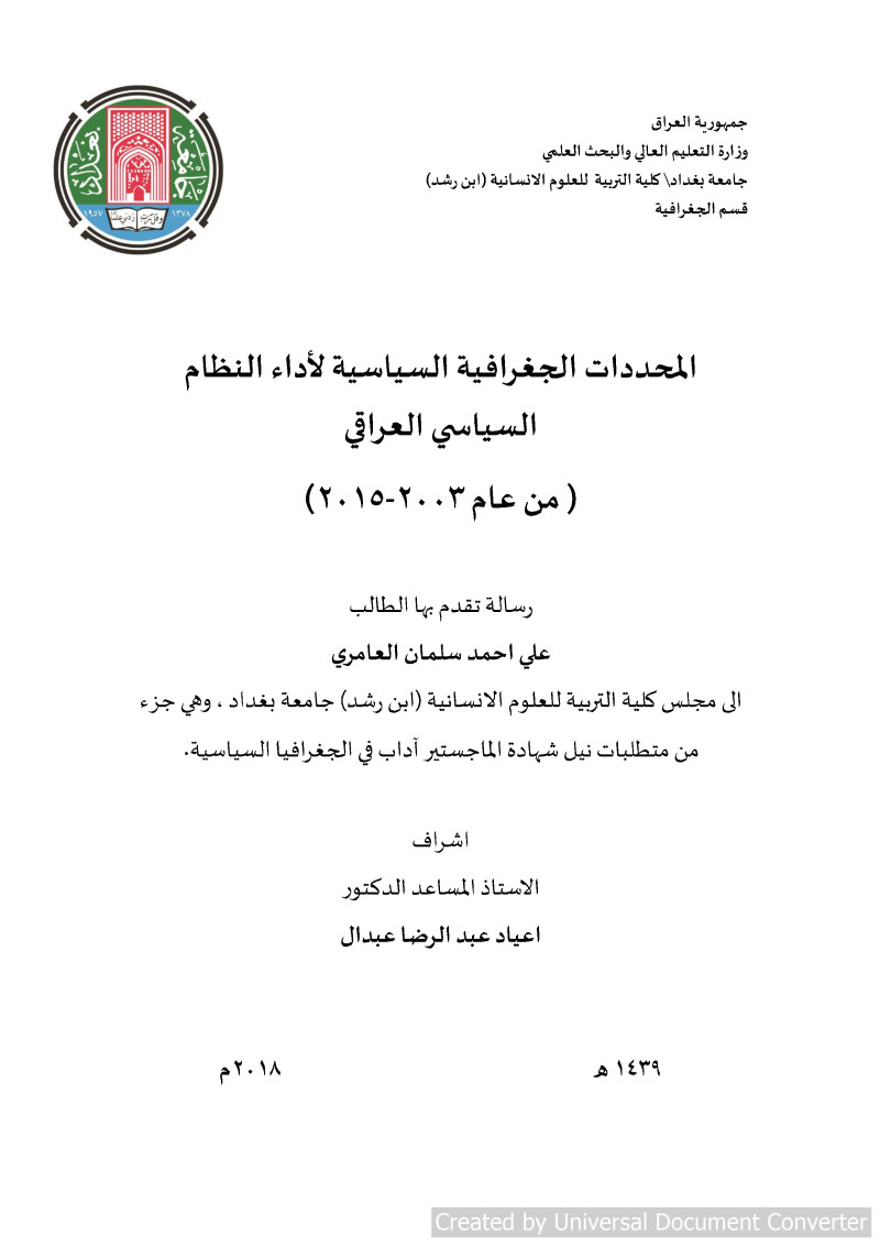 المحددات الجغرافية السياسية لاداء النظام السياسي العراقي ( من عام 2003-2015) = The Geopolitical Determinates of the Functioning of the Iraqi Political System (from 2003 – 2015) / علي احمد سلمان العامري ؛ اشراف الاستاذ المساعد الدكتور اعياد عبد الرضا عبدال.