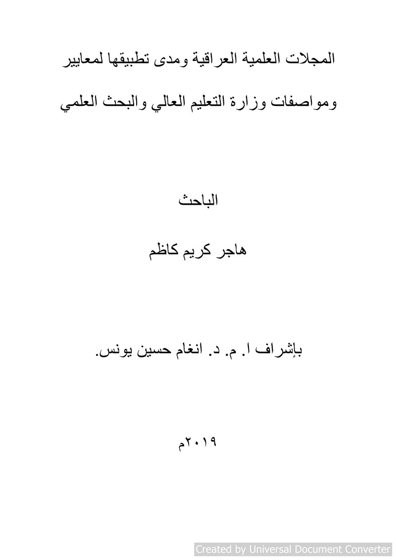 المجلات العلمية العراقية ومدى تطبيقها لمعايير ومواصفات وزارة التعليم العالي والبحث العلمي = Iraqi scientific journals and the extent of their application to the standards and specifications of the Ministry of Higher Education and Scientific Research / هاجر كريم كاظم ؛ بإشراف ا. م. د. انغام حسين يونس.