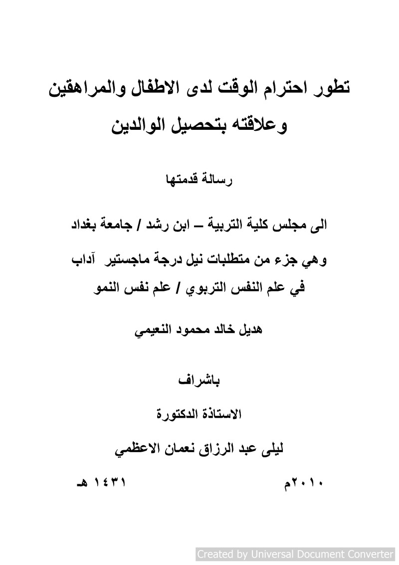 $aتطور احترام الوقت لدى الاطفال والمراهقين وعلاقته بتحصيل الوالدين = $bTime Respect Development of Children and Teenagers and Its Relation to Parent's Achievement / $cهديل خالد محمود النعيمي ؛ اشراف الاستاذة الدكتورة ليلى عبد الرزاق نعمان الاعظمي.